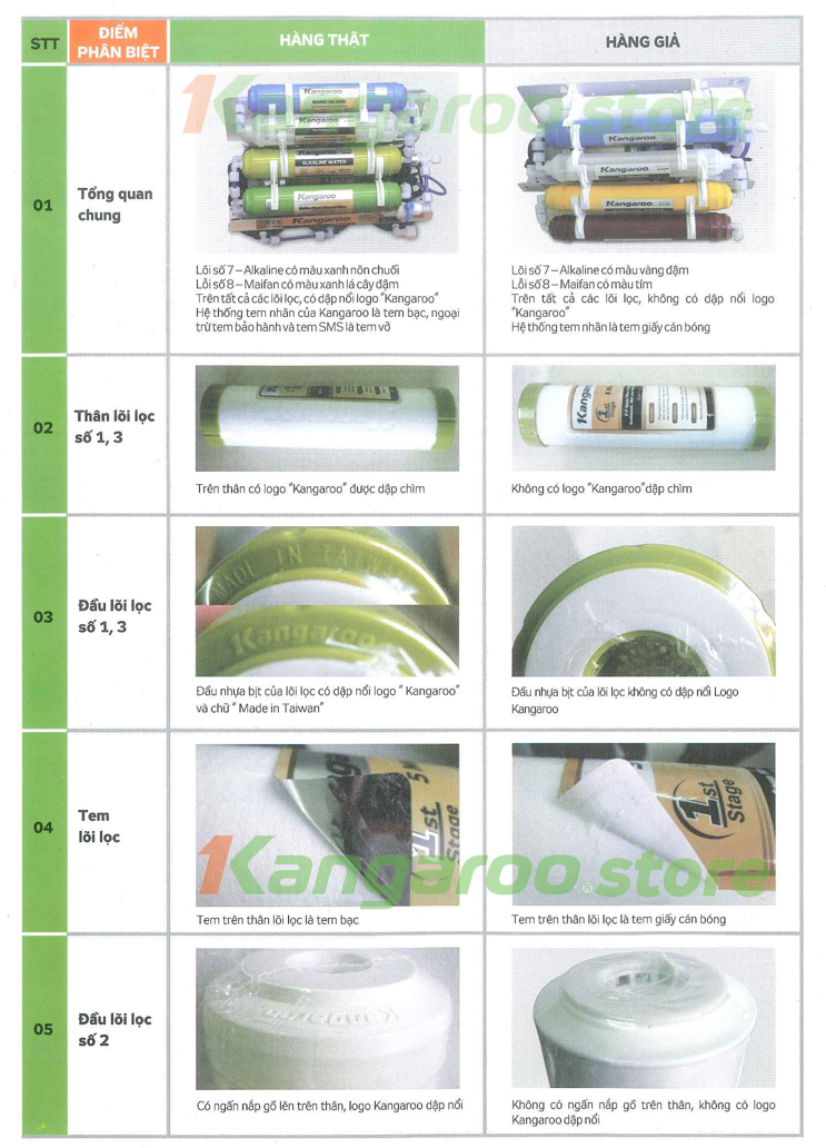 Hiện nay trên thị trường xuất hiện nhiều đại lý, cửa hàng phân phối máy lọc nước Kangaroo làm nhái, làm giả các lõi lọc. Các lõi lọc làm giả có giá thành thấp hơn gấp nhiều lần so với lõi lọc chính hãng. Trong khi khách hàng vẫn phải mua với giá bán cao, khi lắp đặt và sử dụng thì nguồn nước không được đảm bảo. Ảnh hưởng trực tiếp tới sức khỏe người tiêu dùng. Vì vậy Kangaroo Store đưa ra các dấu hiệu nhận biết về lõi lọc thật giả, các linh kiện thật giả để Quý khách hàng có thể tham khảo lựa chọn cho mình sản phẩm tốt nhất!