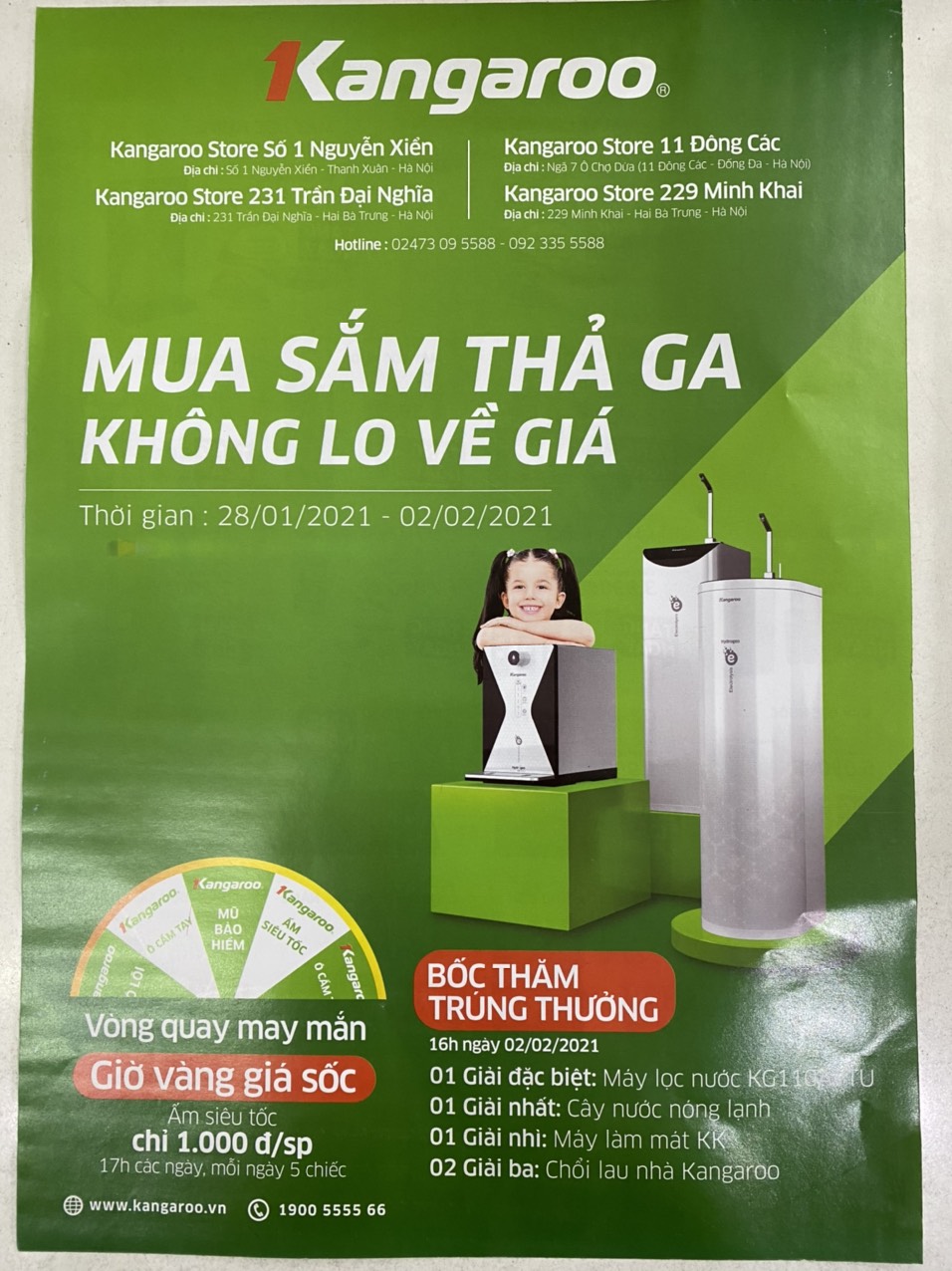 Chương trình sẽ diễn ra từ ngày 28/01 đến hết ngày 02/02/2021 tại Showroom Kangaroo 1 Nguyễn Xiển, quận Thanh Xuân, Hà Nội với các nội dung Giờ vàng giá sốc, bốc thăm trúng thưởng.